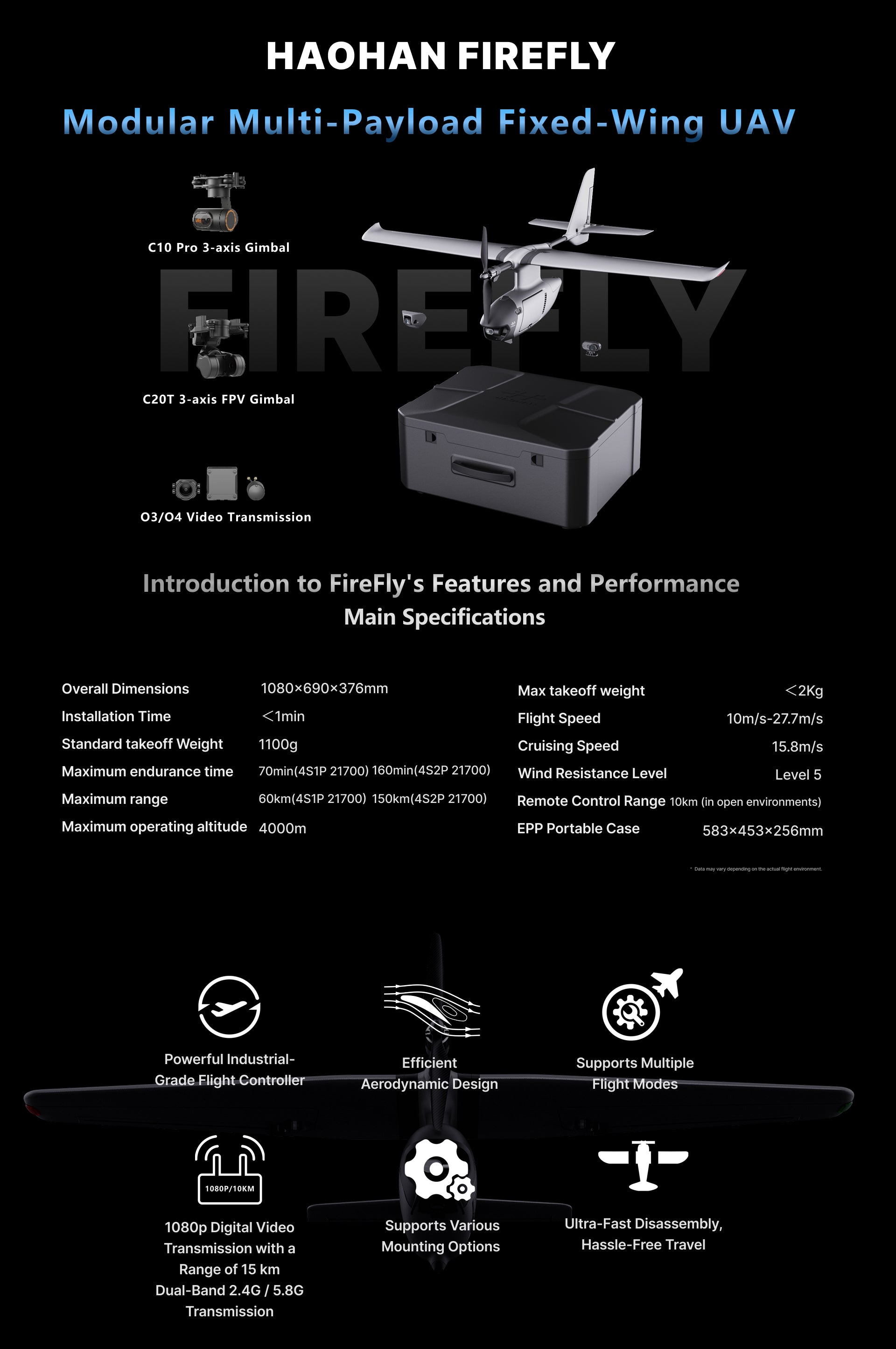 FireFly VTOL Fixed-Wing FPV Drone offers a unique combination of efficiency, portability, and advanced features. With its modular design, aerodynamic efficiency, and intelligent flight control, it is well-suited for various applications including law enforcement patrols, reconnaissance, and emergency rescue missions.