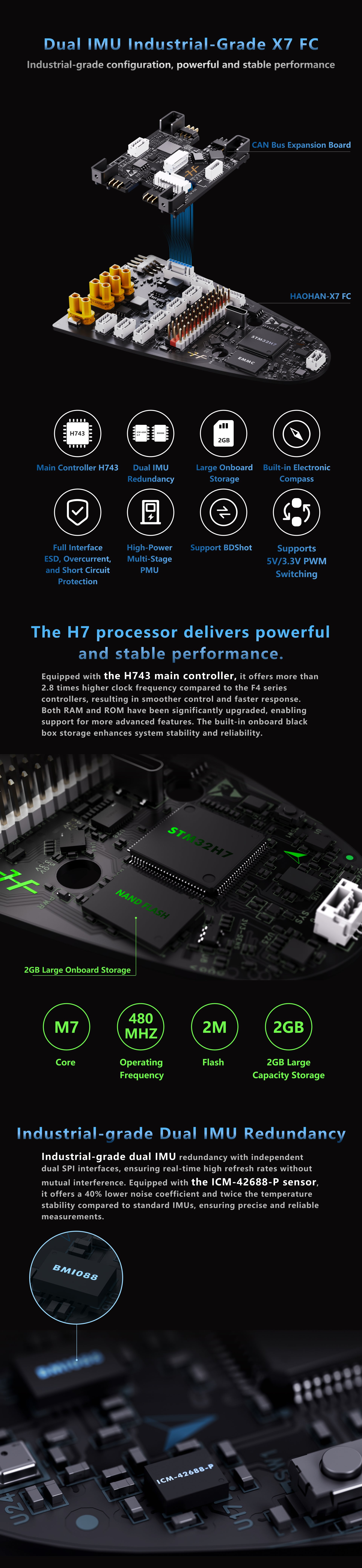 - IMU (Inertial Measurement Unit): ICM-42688-P and BMI088 (dual IMU redundancy)