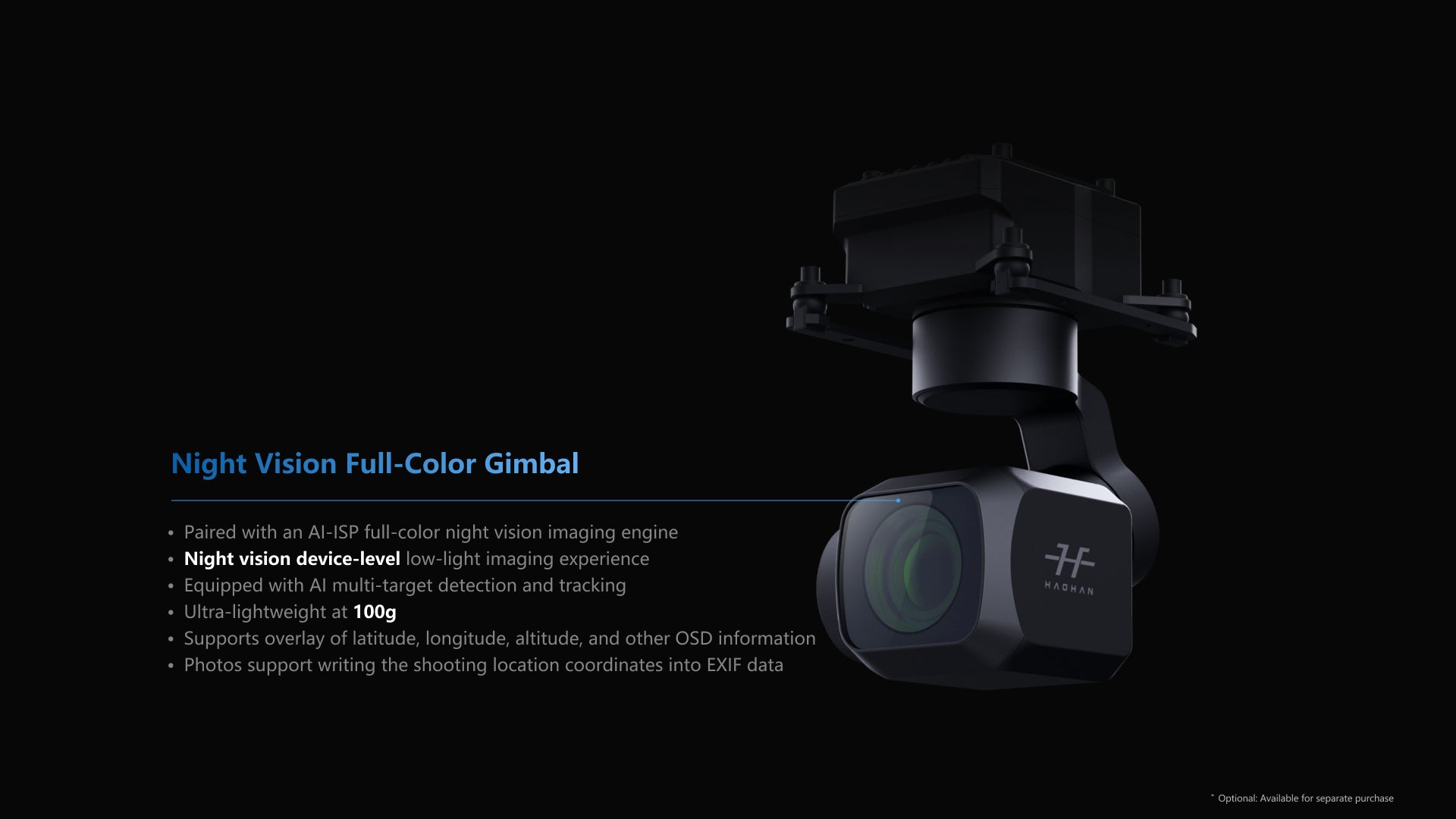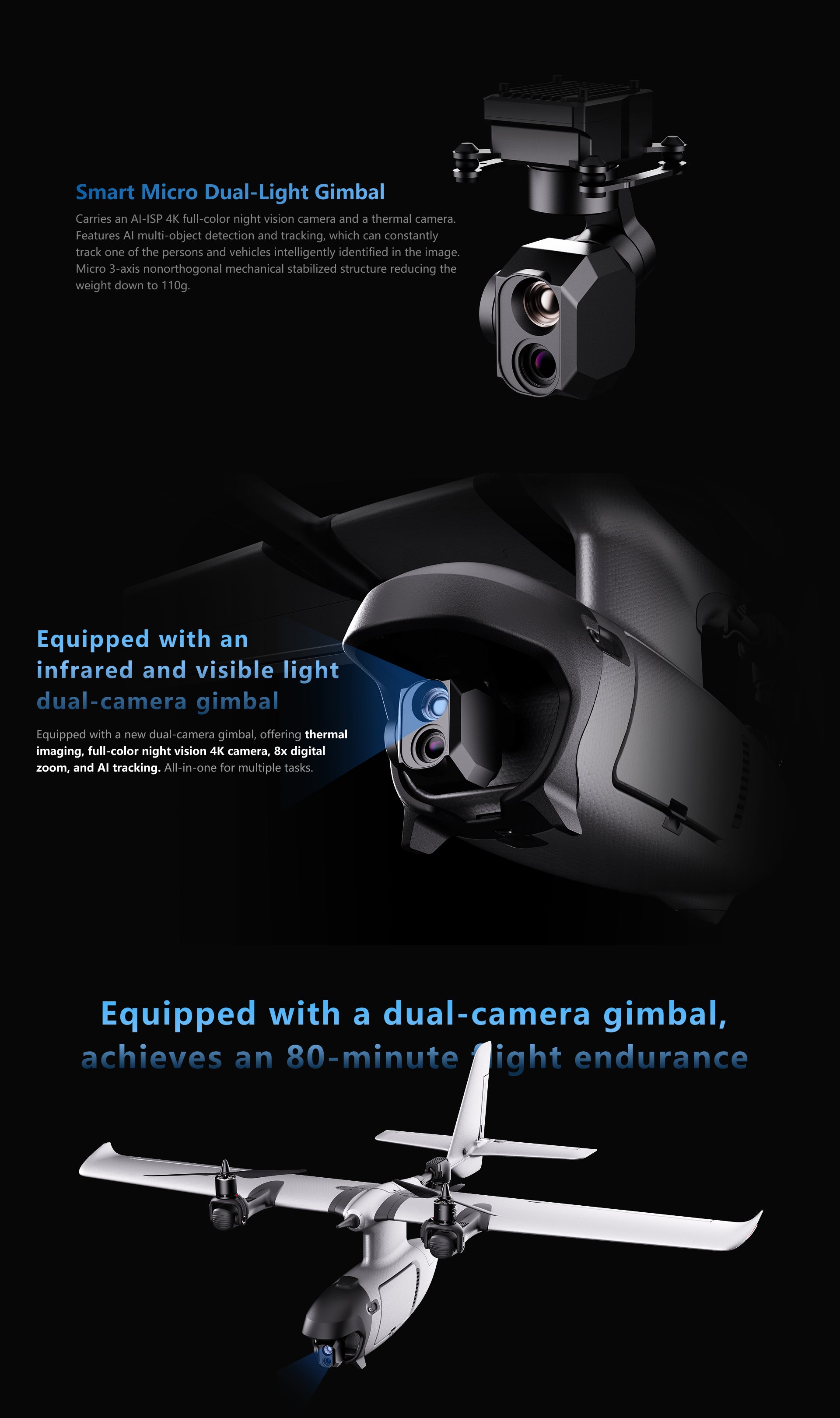 Carries an AI-ISP 4K full-color night vision camera and a thermal camera.